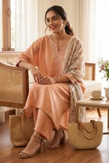 Peach Silk Kaftaan Kurta Set with Neckline Embroidery