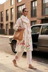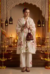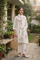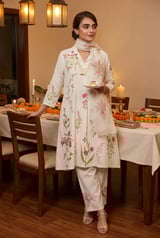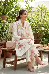 Off-White Floral Block Print A-Line Kurta Set with Dupatta